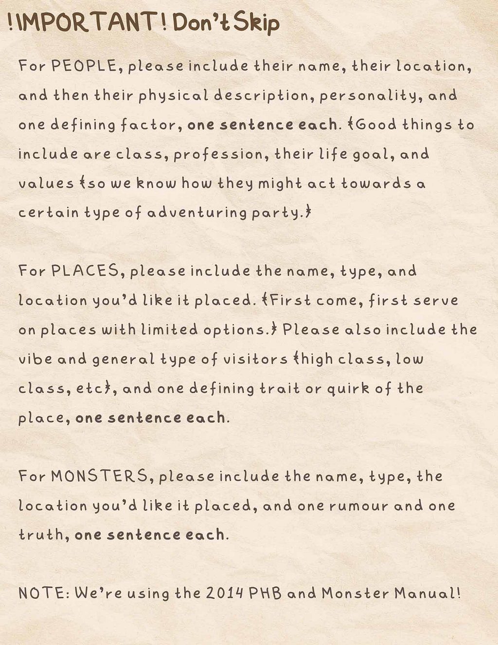 (within reason, innapropraite names will not be included and changed). We encourage you to think geographically — valleys, ridges, rivers — but have fun with it. “Whistletop Ridge” makes sense if the wind howls through the peaks, but “Jeff’s Steppe” also works… as long as we can all agree Jeff must’ve done _something_ worth naming a steppe after, even if he tragically fell to his death.
